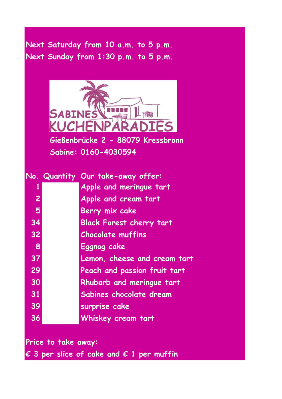you are ordering in another language, print out the flyer in your language and write the number of pieces of cake you would like behind it.