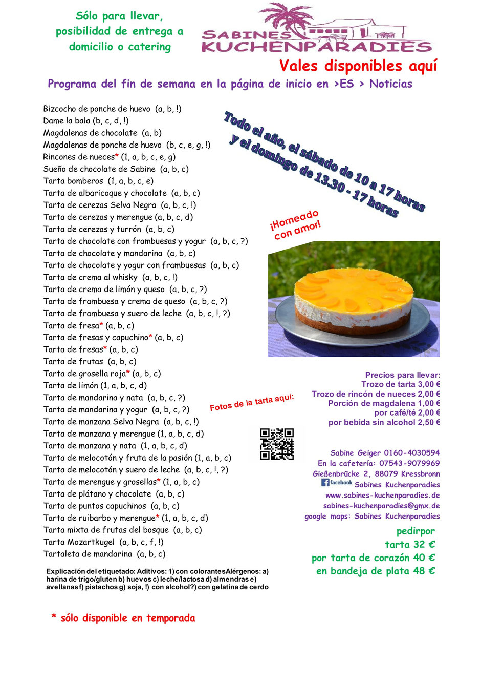 consulte Noticias). Puede encargar y recoger pasteles enteros diariamente (con tres días de antelación).