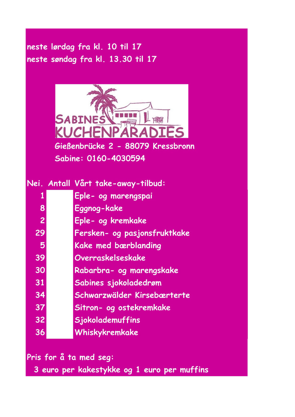 Her kan du se helgens program, slik at du kan velge på forhånd og reservere hos Sabine på 0160-4030594 eller via Whatsapp, slik at du kan hente den senere hvis det er nødvendig. Hvis du