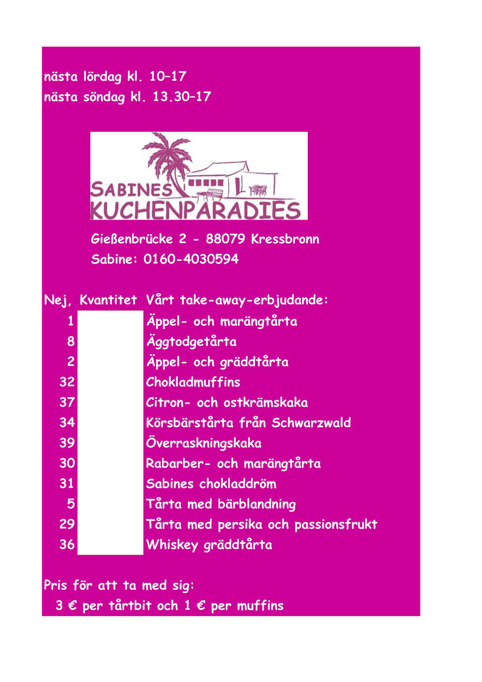 Helgprogrammet visas här, så att du kan välja i förväg och göra en reservation med Sabine på 0160-4030594 eller via Whatsapp så att du kan hämta den senare om det behövs. Om du beställer